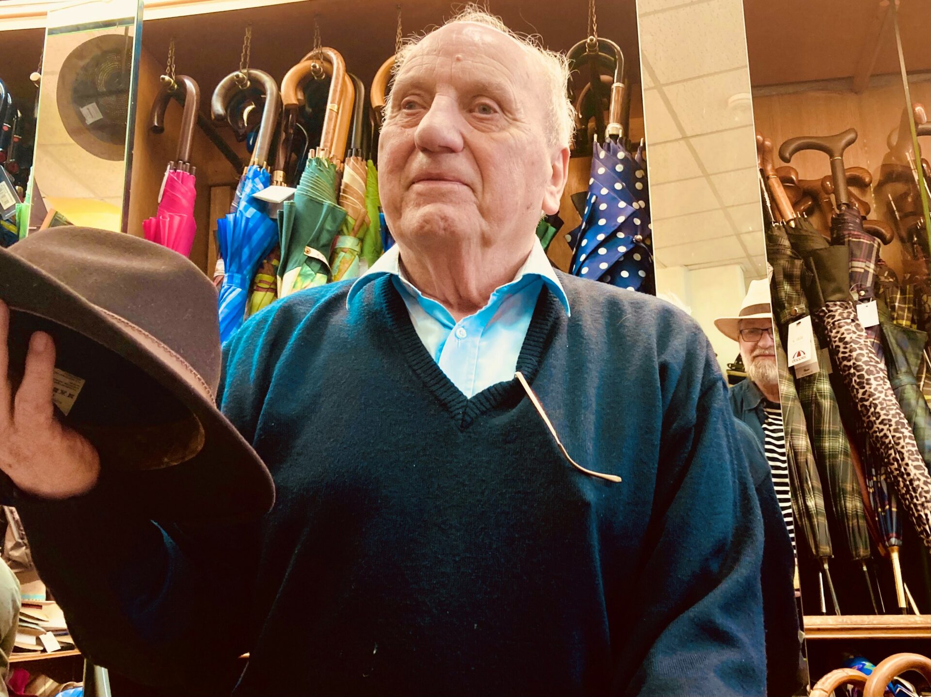 Ich entscheide mich für den Panamahut. Doch draußen nieselt es schon wieder. „So, jetzt brauche ich noch einen Schirm.“ Genauso zielsicher wie zuvor geht Herr Kappertz zu der Auslage mit den Schirmen. „Hier, ich empfehle Ihnen das Modell Stockholm, beste Qualität und der schwarzweiße Streifenlook steht Ihnen einfach.“ Ich bin begeistert, solide Technik, guter Griff, lässiger Look. „Und das Beste ist, wenn tatsächlich mal etwas wackelt, wir reparieren die Schirme auch in der eigenen Werkstatt.“ Der Inhaber rollt den Schirm ein, zieht das Futteral über und kommt ins Plaudern. „Mit den Schirmen und Spazierstöcken hat eigentlich alles angefangen. Opladener Schirmfabrik Gustav Adrion hieß es vor dem 1. Weltkrieg. Das Sortiment wurde über die Jahrzehnte immer erweitert. Auch nachdem ich das Geschäft 1968 übernommen habe.“ Christian Kappertz zeigt auf die Pakete hinter sich. „Und wir sind jetzt auch rund um die Uhr erreichbar. Die Kunden bestellen in unserem Onlineshop und sie schicken uns auch Schirme zur Reparatur.“