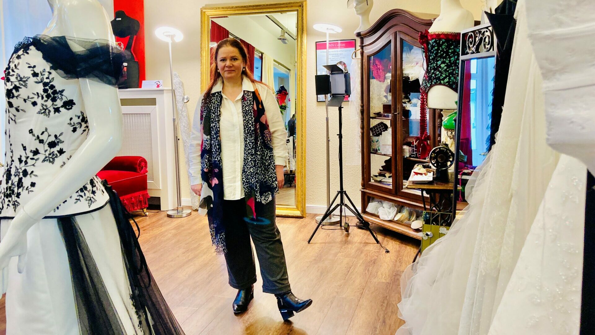 „Wer mich hier aufsucht, der lässt die Welt da draußen hinter sich.“ Anja Neuser steht in ihrem Showroom und breitet die Arme aus. „Die Menschen, die hierher kommen, bringen langgehegte Wünsche mit.“ Vornehmlich seien das Kundinnen. „Eigentlich“, sagt sie, „führen wir hier bei der Beratung Seelengespräche.“ Tränen der Freude und eskalierende Herzen – „diese Wände haben schon alles gehört und gesehen. Aber dieses Atelier ist ein geschützter Raum. Hier dringt nichts nach außen.“ Sie deutet aufs Schaufenster: „Sehen Sie die Vorhänge. Die ziehen wir bei jeder Anprobe zu.”