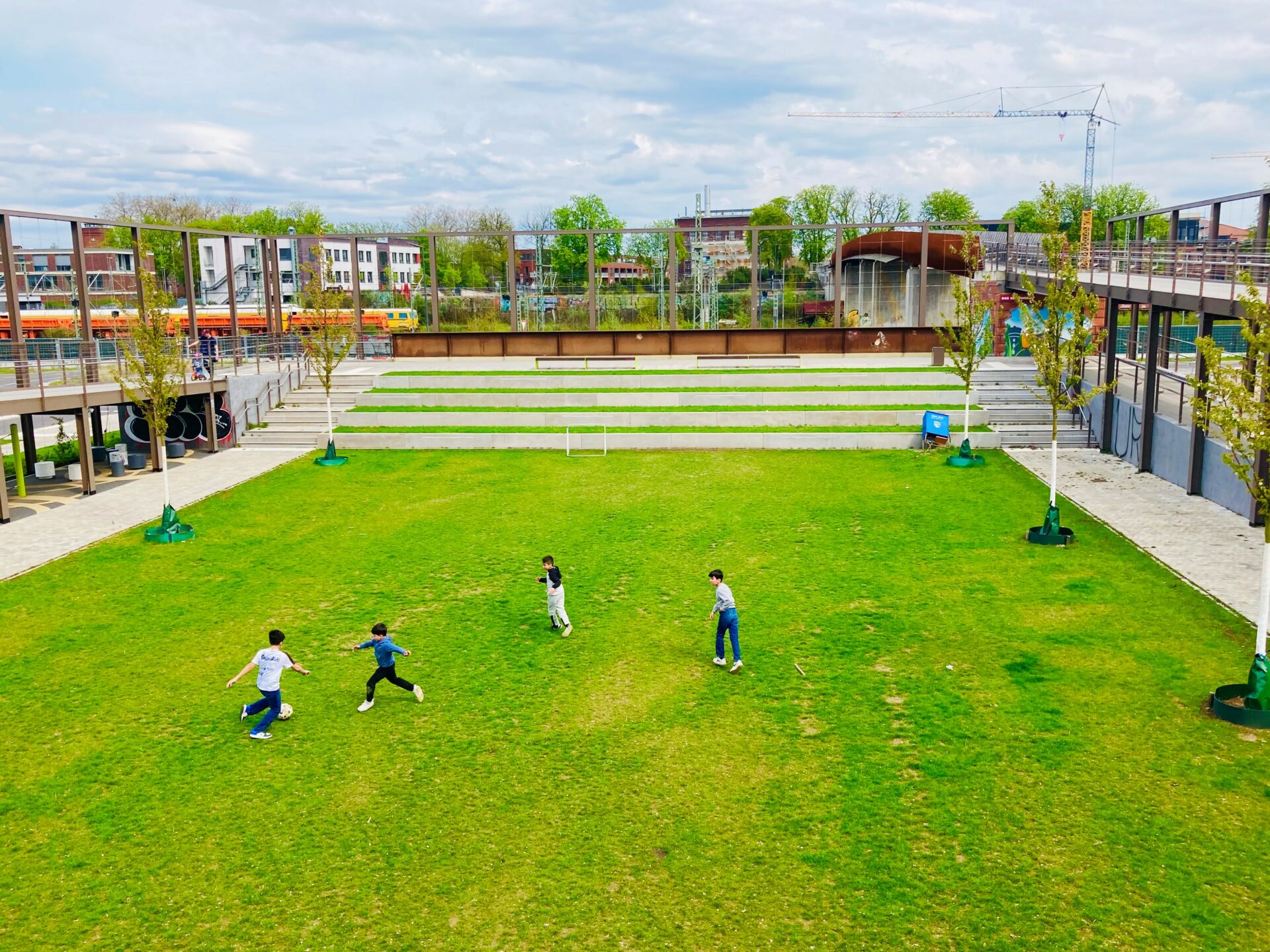 Die neue Grünfläche mit Spielgeräten und einer Art Treppentribüne wird eingerahmt von einer Rampe, die in Verlängerung der Campusbrücke den Fußgänger- und Radverkehr aufnimmt. Der Brückenpark ist also nicht nur Trittstein von der Neustadt hin zur Neuen Bahnstadt Opladen. Inmitten der Rampe, die von früh bis spät für Bewegung rundum sorgt, entsteht ein grüner Platz für alle Generationen.