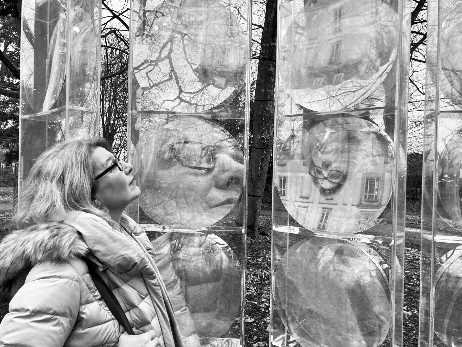 Das Museum schließt. Und wir drehen gemeinsam noch eine Runde durch den Schlosspark. Vor der Skulptur „Integration“ von Adolf Luther bleiben wir stehen. Cornelia Lönne schaut nach oben in die Hohlspiegel, die dieses Kunstwerk ausmachen. Ihr Gesicht doppelt sich, dreht sich und bewegt sich. Im Hintergrund changiert die Kulisse des barocken Schlosses. „Bleiben Sie so“, bitte ich sie und drücke auf den Auslöser.