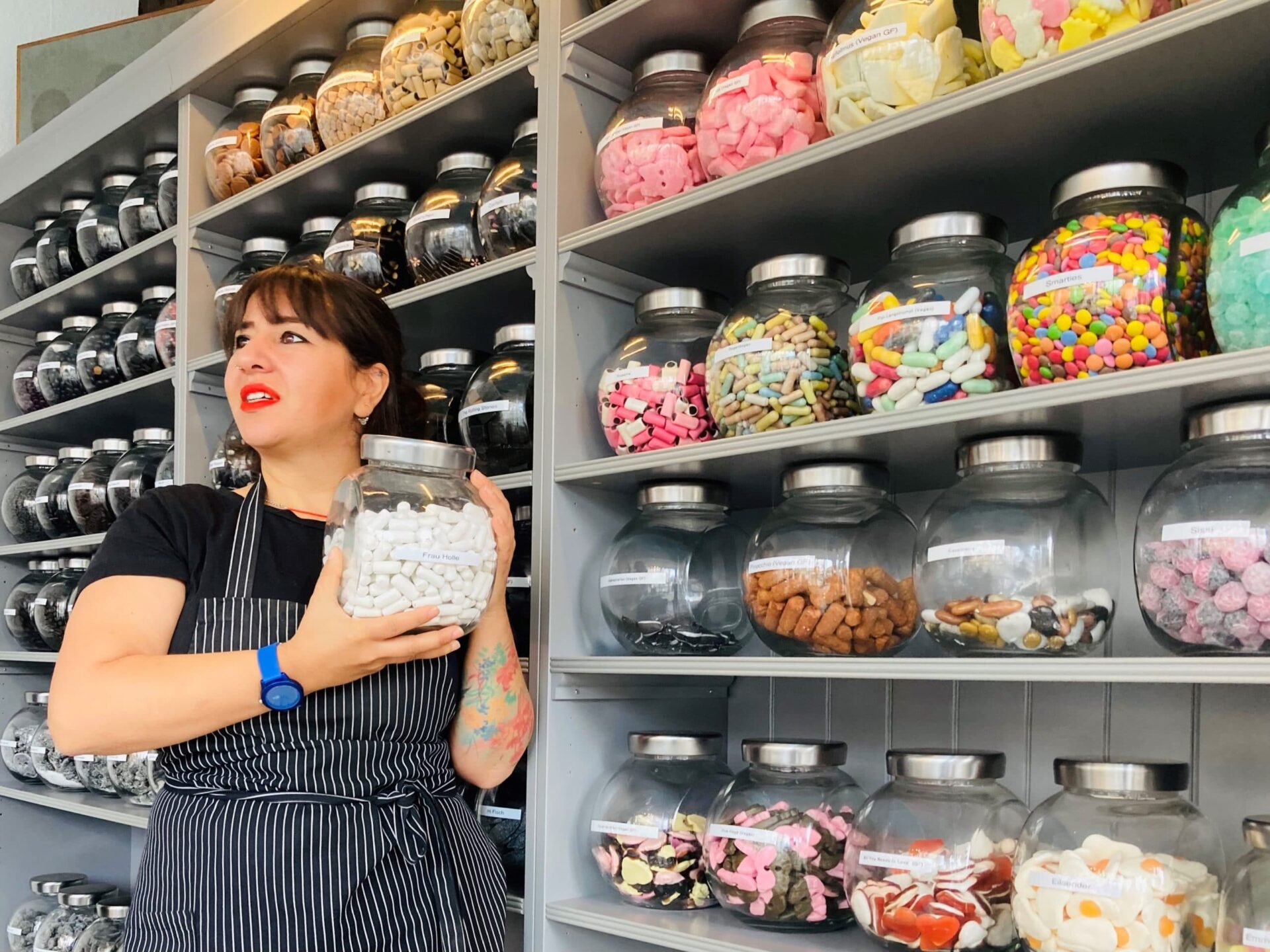 Was für Geschichten dahinter wohl stecken mögen, frage ich mich, als ich gerade einen veganen Eric Clapton verkoste. „Ich mag Süßes, Karamelliges und seine Musik.“ Okay. Die Namedrops bleiben auf jeden Fall im Gedächtnis, allein dadurch dass jede Sorte auch probiert werden darf. Und selten habe ich jemand so charmant und kundig zugleich über die Geschmacksnoten der einzelnen Lakritzsorten sprechen hören wie Deriya Deniz-Isik. Augen zu und untermalt von Marvin Gaye´s Gesang explodiert der Toffee namens Rolling Stones am Gaumen. Und schon geht es weiter: „Mögen Sie Lakritz umhüllt von Schokolade?“ Die Sorte mit weißer Schoki heißt Marylin Monroe, die mit schwarzer Michael Jordan. Die Schokolade schmilzt und wird dann von Lakritz in Schach gehalten. Und wie schmeckt eigentlich Abba? „Sie beißen hinein und schmecken Karamell, Lakritz mischt sich erst später ein. Bitte probieren Sie.“ Sensationell. Wie heißt es so schön in dem Abba-Song „Love isn´t easy“: „Sweet sweet, our love is bitter-sweet“. Und zum guten Schluss gibt es noch zwei Herzen für die Liebste und die Tüte wird auch noch beherzt verpackt. Ein eindrücklicher und sehr unterhaltsamer Einkauf. Für alle, die die dunkle kulinarische Seite in sich entdecken möchten! Voilá!