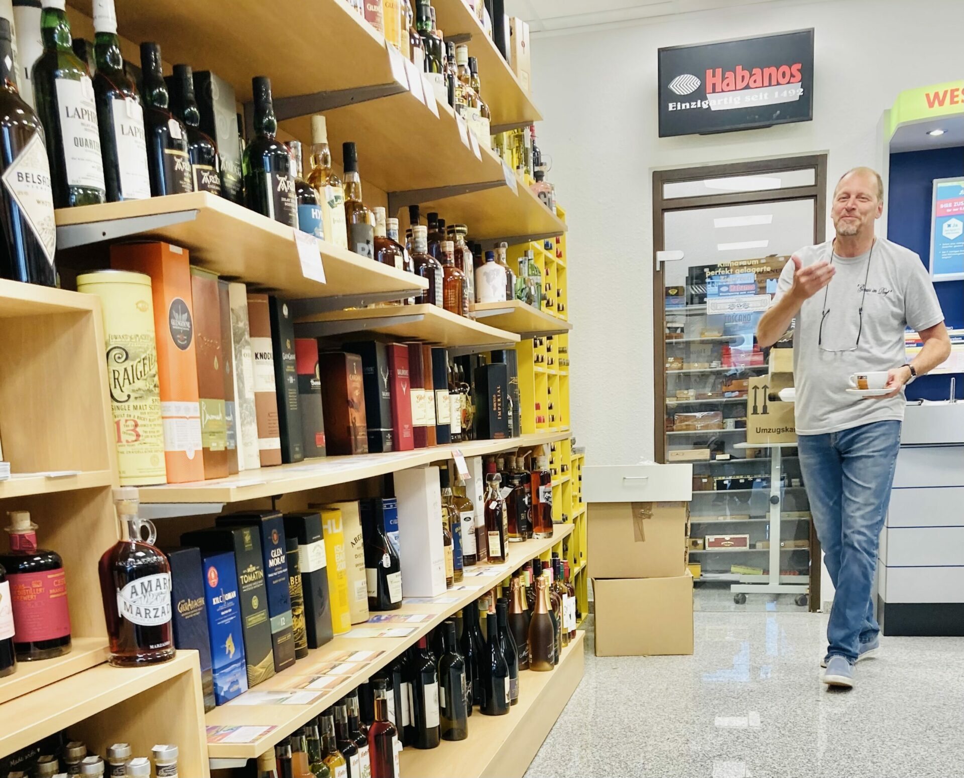 Womit aber schießt „Genuss im Dorf“ in Schlebusch und im Umkreis von Köln und Düsseldorf den Vogel ab. Neben Rauchwaren von der Stange unterhält Scheuß einen begehbaren Humidor. Über hundert Sorten an Zigarren und Zigarillos lagern hier. „Zeigen Sie mir eine Lottobude, die über so ein Sortiment an Rauchwaren und edlen Tropfen verfügt.“ Der Genussmensch, der in seinem früheren Leben in der „Traube Tonbach“ gekocht hat, lacht sich ins Fäustchen und schon steht er vor dem großen Regal mit Spirituosen. „Mein Sortiment ist handverlesen.“ Gutes liegt dabei manchmal so nah. Aus Rösrath kommt der „Ewald Finest Rum“. “ Der lagert acht Jahre im Eichenfass bis zur vollen Reife. „Ein Bouquet, sage ich Ihnen, das reicht von Kokos, Zimt, Bananen,Vanille bis hin zu kandierten Früchten.“ Oder wie wäre es mit Gin? Scheuß preist den „No 224 Gin“, der im Nachbarort Odenthal in Handarbeit produziert und abgefüllt wird. „Ein Spitzengin, den Sie pur oder im Sommer gerne mit Wild-Berry-Tonic geniessen sollten.“ Sicherlich ließe sich unser Gespräch endlos fortsetzen, stünde da nicht schon wieder eine Schlange. Wer das Gespräch mit dem Genießer weiterführen möchte, dem seien die Tastings im Alten Bürgermeisteramt empfohlen. Vor allem geht es dann zur Sache. „Zum Wohl, meine Damen und Herren.“