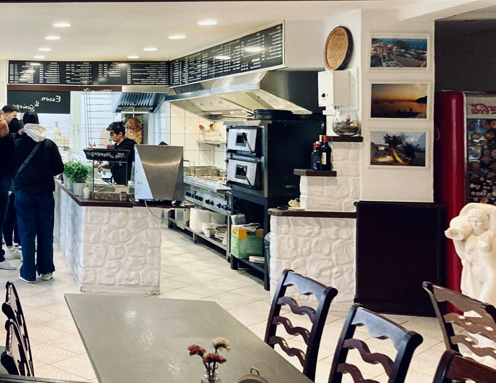„Gyros ist nicht gleich Gyros.“ Wenn mich Elena Topsikiotou aus ihren braunen Augen anschaut, glaube ich ihr alles. Doch die Chefin des Gyros Palast holt extra für mich eine Box aus der Kühlung. „Schau mal hier. Das sind Scheiben aus der Schweinerippe, die wir vom Schlachter bekommen.“ Sie hält eine Scheibe hoch, sie ist leicht marmoriert und hat einen ordentlichen Fettrand. „Das macht unser Gyros so schön saftig.“ Über Nacht wird das Fleisch mariniert. „Ich würze nach einem Rezept meines Großvaters. Das bleibt auch mein Geheimnis.“ Da ist es wieder das Blitzen in Elenas Augen. „Wir schichten dann die Scheiben auf dem Spieß. Und das Ergebnis siehst du hier. Ganz ohne Konservierungsstoffe.“ Sie zeigt stolz auf den Drehspieß hinter sich. Goldbraun glänzt er in der Fläche, krosse Ansätze sorgen auf dem Teller für zusätzliche Würze.