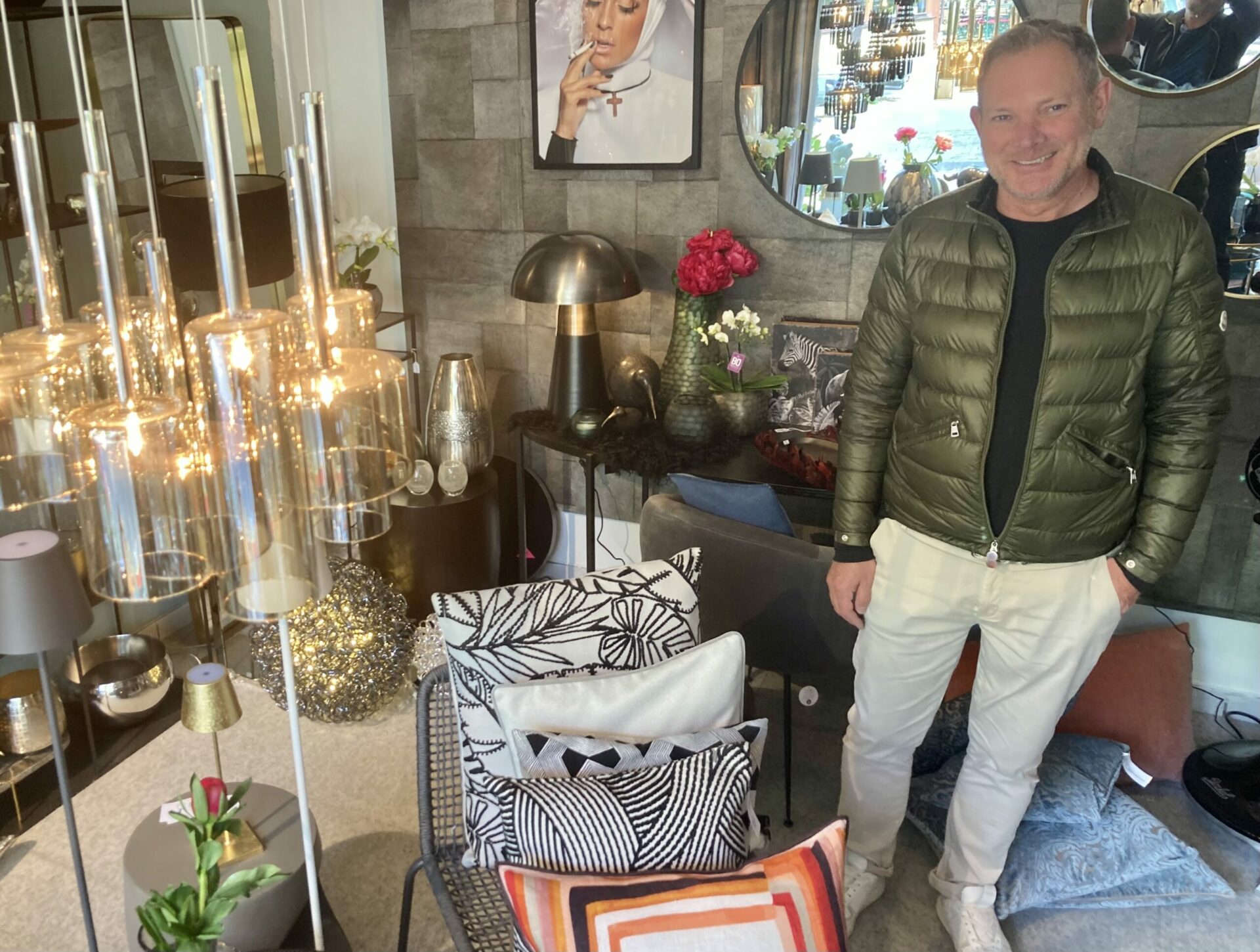 Wer durch das Fachgeschäft für Interior Design am Lindenplatz streift, dem drängt sich eine Frage auf. Wie kann ein Mensch, so viele schöne und gleichzeitig ausgefallene Dinge zusammentragen. Thorsten Mack kann das. Das beweist er seit 2014 mit Home Fashion im Dorf. „Seit 2019 bespielen wir das gesamte Haus, ein Bau aus der Gründerzeit mit viel Charme. Jetzt gibt es ausreichend Platz, abgestimmt auf die Saison, alle aktuellen Trends vorzustellen“, erklärt Thorsten Mack sein Konzept. Aber es gibt nicht nur zwei Etagen, sondern auch der Garten wird als Showroom genutzt. Im Prinzip findet hier Ästhetik pur verdichtet auf drei Ebenen statt. Die Kunst dabei ist, die Aufmerksamkeit der Kundschaft auf kleine Inszenierungen zu ziehen, die sich auf einem Sofa oder einem Esstisch oder an der Wand abspielen. Es wimmelt vor Ideen auf engstem Raum und doch wird eine Ordnung erkennbar. Wohin wir auch schauen, es wird eine Handschrift sichtbar. Dabei trifft man auch immer wieder mal auf gewagte Einfälle, wie das kleine weiße Porzellaneinhorn, das unter der Holzklappe des Holzverkaufsbude wacht und nebenan plätschert ein mehrstöckiger Springbrunnen vor sich hin. Das muss der Zuschauer nicht mögen, denn da hinten gibt es bereits eine rote Gartenliege gerahmt von Bambus, die die Blicke auf sich zieht.