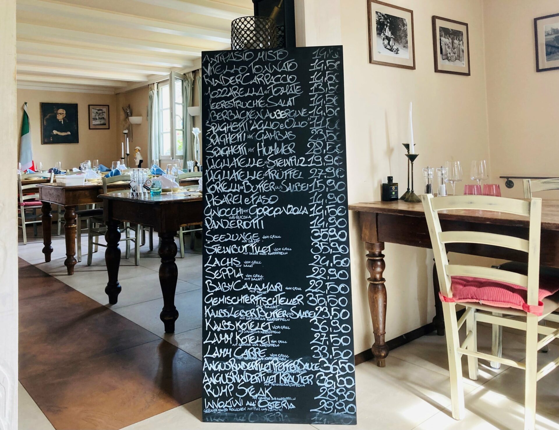 Wer sich auf den Weg zur La Vecchia Osteria macht, fährt aufs Land. Am Ende von Lützenkirchen angekommen und schon ertönt ein freudiges: „Buon Giorno!“ Der Padrone Renato Fendi kommt aus der Küche und begrüßt den Gast vor der Theke. Durch den Gastraum in dem bergischen Fachwerkhaus weht die Brise Mittelmeer. Schwarzweiß Fotografien mit Straßenszenen und Porträts sorgen für das Authentische, Kerzen auf den rustikalen Tischen schaffen das Romantische. Allein die Tagesangebote von Antipasto misto bis Involtini all´Osteria auf der großen Schiefertafel machen die Wahl zur angenehmen Qual. Die Gnocchi waren offensichtlich handgeformt und die Soße spielte mit der Würze des Gorgonzola, ohne zu dick aufzutragen. Mit dem zweiten Gang kamen auf den Punkt gegrillte Baby Calamari mit Salatbeilage. Genuss statt Völlerei ist hier die Devise. Schönes Ambiente und freundlicher Service sind das Eine. Wirklich entscheidend ist, was kommt auf den Tisch, in das Glas und auf den Teller. La Vecchia Osteria bietet eine gehobene Küche zu ebensolchen Preisen. „Arrivederci alla prossima.“