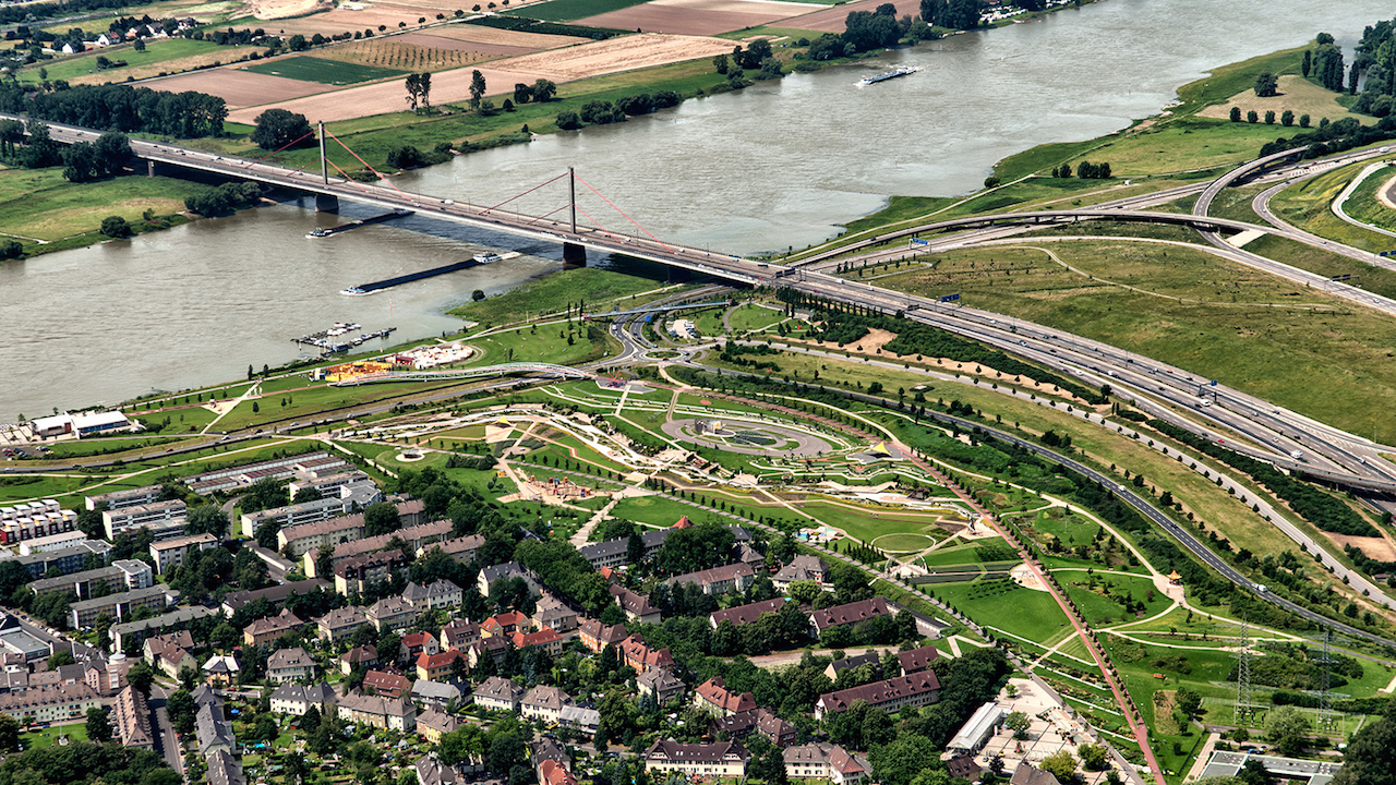Das Gelände der ehemaligen Landesgartenschau in Leverkusen ist ein Paradebeispiel wie sich ein ehedem unwirtliches Areal zu einem beliebten Naherholungsgebiet umgestalten lässt. Über Spiel- und Sportanlagen bis hin zu zehn Themengärten entwickelt sich die Stadt zum Rheinufer hin. Die Bebauung und Begrünung kommt licht daher, hier atmet die Stadt gewissermaßen auf.