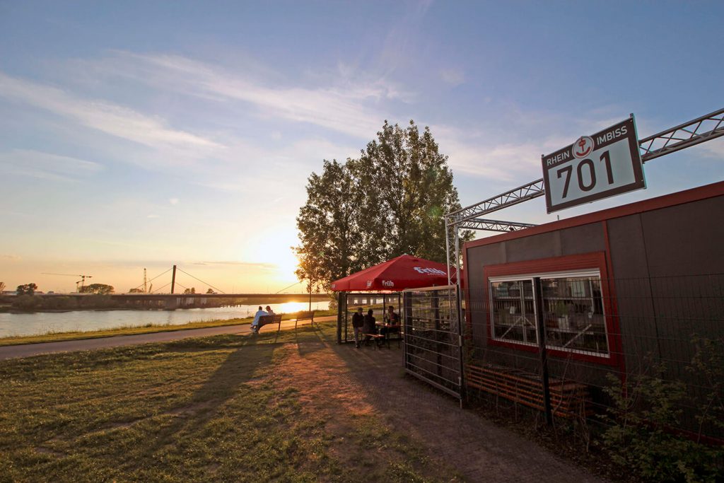 Der Rhein Imbiss liegt direkt am Rheinkilometerstein 701. Damit wären schon mal die Koordinaten und der Ausblick auf den großen Strom anbei geklärt. Die 701-Speisekarte bietet die Imbiss-Klassiker Pommes, Wurst, Burger. By the way: Der Cheeseburger ist Legende und die Pommes Spezial lassen Rotterdam und Nordseeblick ganz nahe rücken. Getränke wie das Schreckenskammer Kölsch und Wein aus dem Ahrtal gibt es auch nicht an jeder Bude. Hier wird auf Stil gesetzt und es gibt im Rhein Imbiss 701 auch Besteck und Porzellangeschirr.
