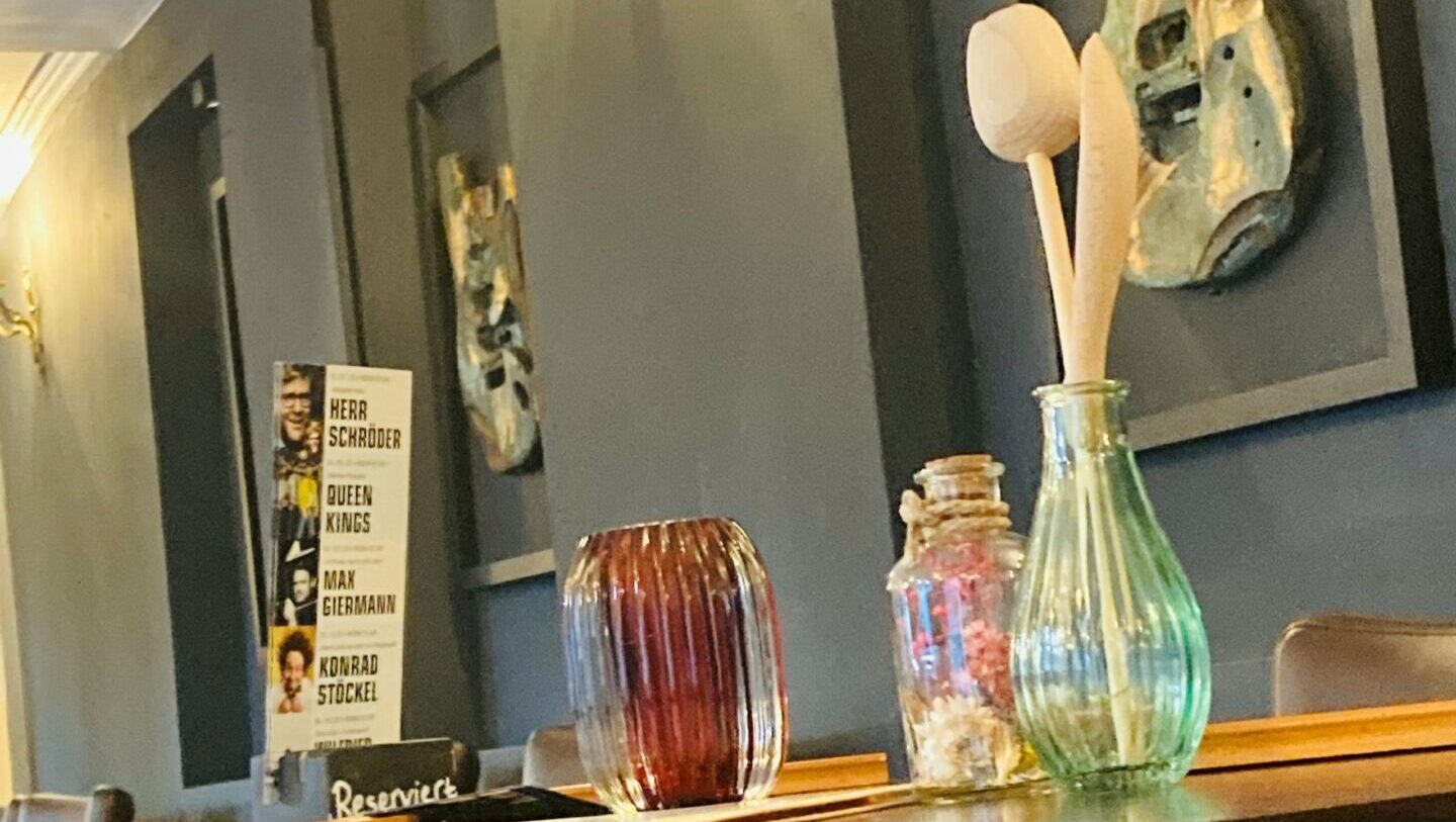 Die Uhlandstraße in Opladen wird in Sachen Kultur am besten mit Scala und 3 C beschrieben. Scala Cinema, Scala Club und seit 2020 auch Canapé. Das Restaurant wird von Annika und Fabian Stiens betrieben. Ja, letzterer ist auch für den Club und die Leverkusener Jazztage verantwortlich. Kein Wunder also, dass jetzt auch der Restaurantbetrieb vom Scala-Mood beseelt ist. Wer den Gastraum betritt, spürt das. Fabian Stiens begrüßt heute Abend die Gäste und strahlt die gewohnte herzliche Lässigkeit aus. Wir werden platziert und während wir die Karte studieren, wird schon mal ein Pastis serviert, stilecht kommt das eiskalte Wasser in der Pernod-Karaffe auf den Tisch. Ich entscheide mich für die Variante Pernod pur, das schärft die Geschmacksnerven. Der Name Canapé suggeriert eigentlich schon die Speisenauswahl: Wir entscheiden uns für ein Potpourri an Canapés sowie Hauswein und Kölsch. By the way: Die Playlist des Lokals ist gediegen, die übliche Musik gibt es hier keinen einzigen Takt lang auf die Ohren. Eben gehoben wie alles hier ist nicht zuletzt auch die Einrichtung. Im langgestreckten Seitenflügel zieren kunstvoll gestaltete Gitarrenbodies und ein Ensemble Schlagzeugbecken die Wand, rein zufällig die Trennwand zum Club nebenan.