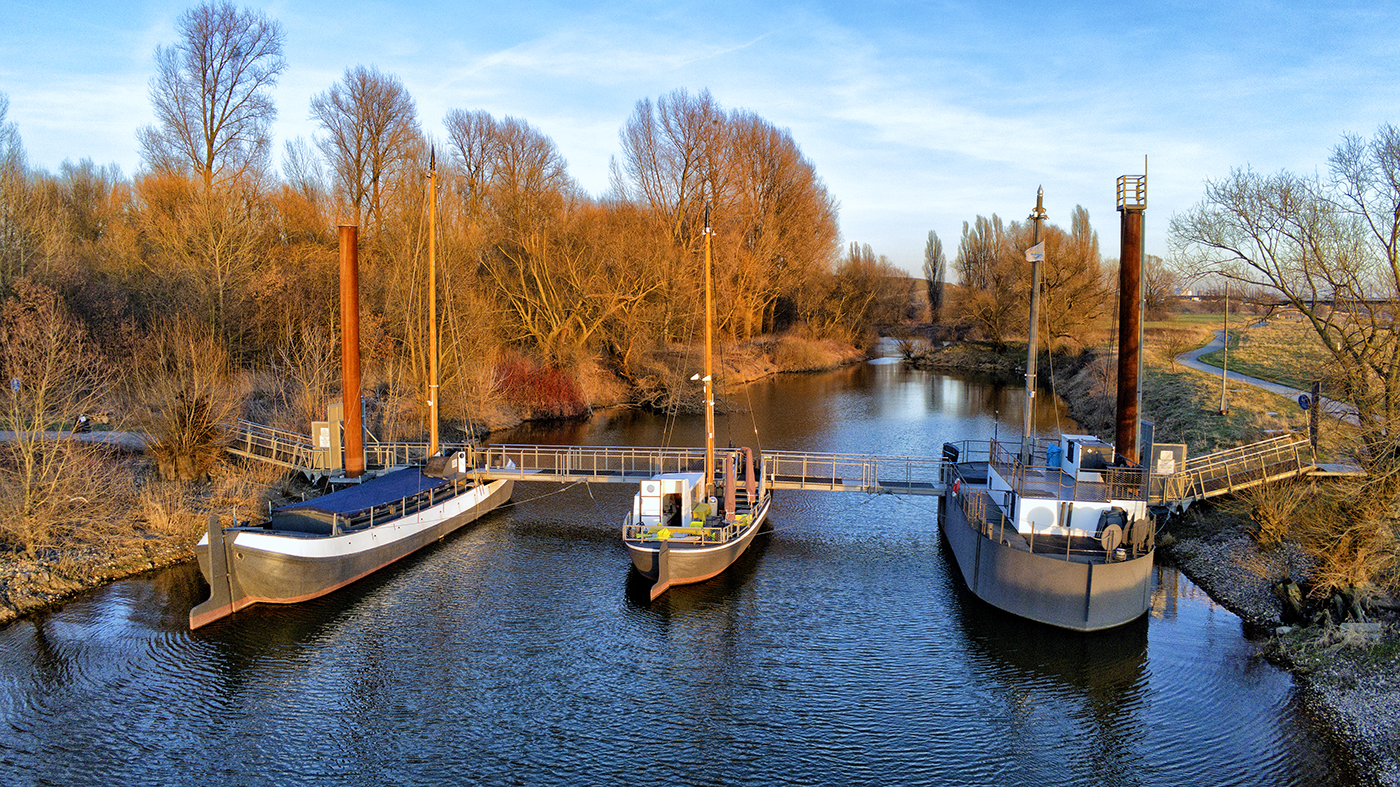 Nach über vier Jahren Pause hat die Schiffsbrücke an der Wuppermündung wieder den Betrieb aufgenommen – zunächst an Wochenenden. In der historischen Tjalk werden Kaffee, Kuchen, Bier, Wein und Würstchen angeboten. Bei schönem Wetter lädt zudem der Ponton zum Verweilen in der Sonne ein.