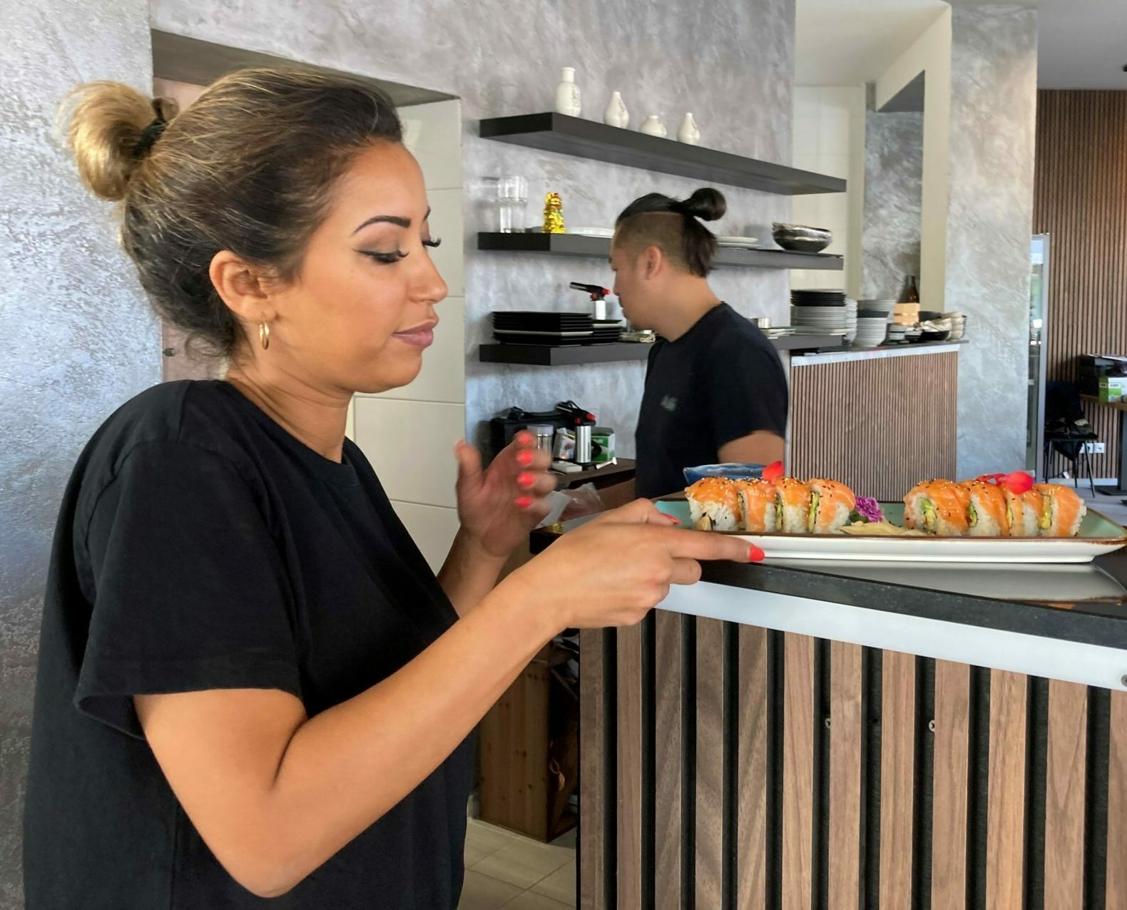 In der Kölner Straße 1 treffen zwei Straßen aufeinander. Das Eckhaus fällt allein durch helle Holzlamellen auf, die umlaufend das gesamte Erdgeschoss rahmen. Große Fensterfronten gewähren Einblick in das Restaurant „Sushicino“. Von außen scheinen dunkelgraue Wände durch und ein Tresen zieht sich ums Eck durch das gesamte Lokal. Vor der Fensterfront reihen sich innen dunkle Holztische und Stühle mit samtig grünem Bezug laden ein sich zu setzen. Ein außergewöhnlicher und angenehmer Ort.
